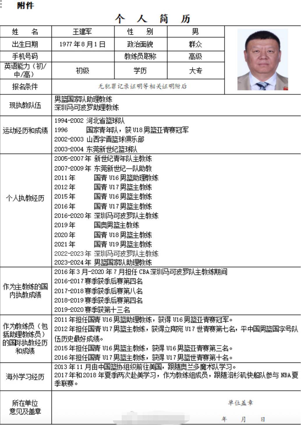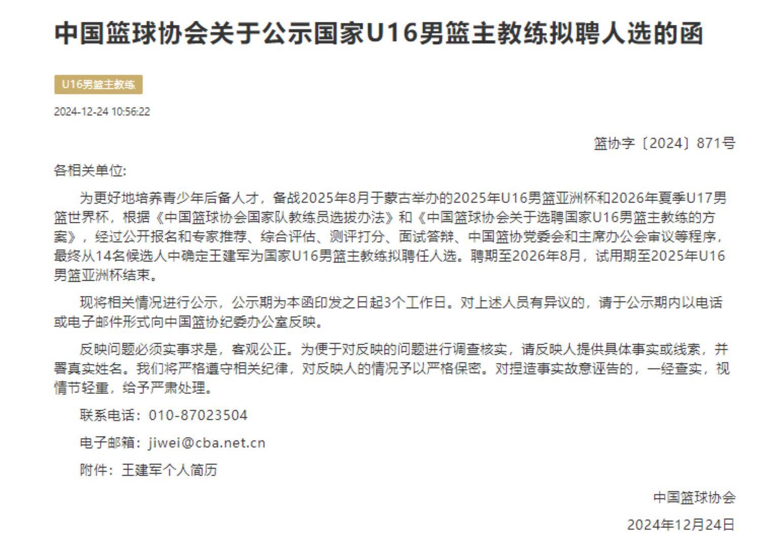 看到这里不免让人感慨,如此强的业务能力却屈尊执教小球员,其奉献精神很是令人钦佩,2024年12月,中国篮协发出了U16男篮主教练拟聘人选。